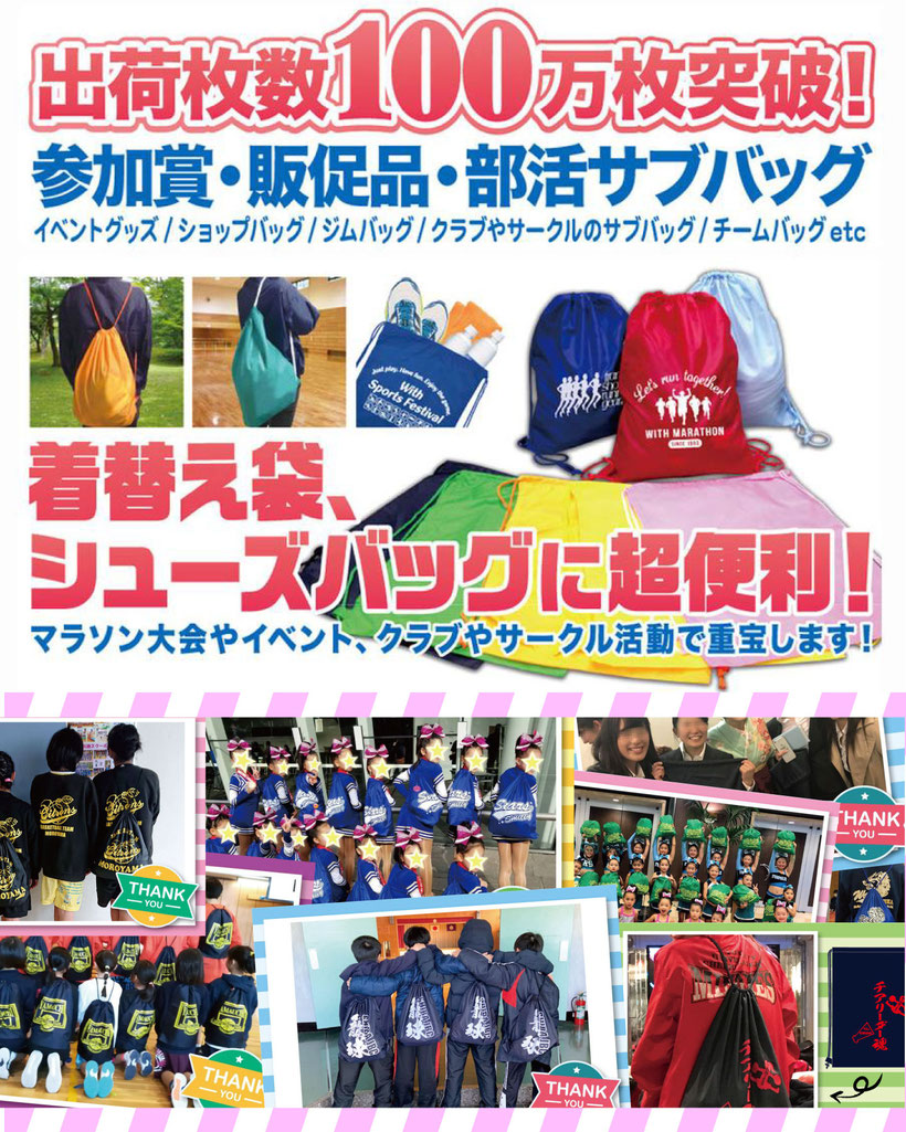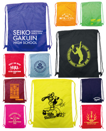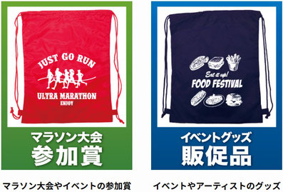 マラソン大会参加賞/スポーツイベントグッズ/販促品/スポーツジムバッグ/ショップバッグ/クラブやサークルのサブバッグ/学校関連/備品袋/アーティストグッズなど幅広くご活用いただいております。